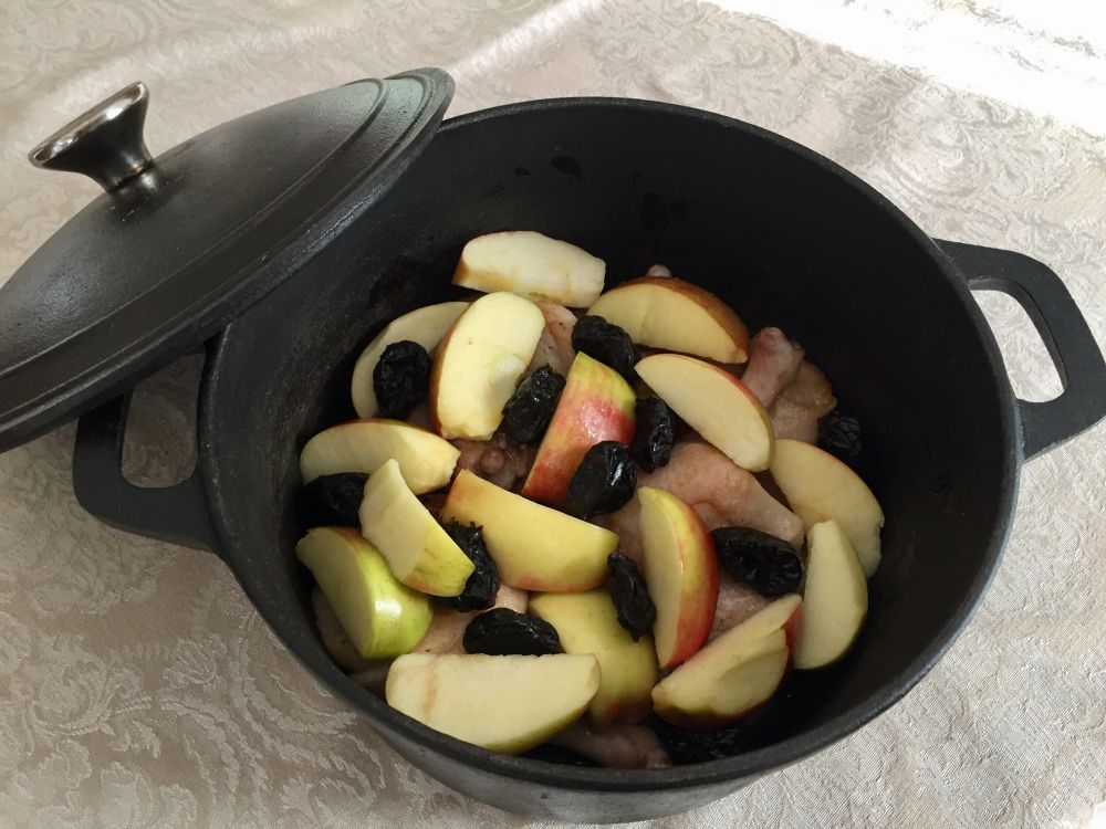 2. 将煎好的鸭腿置锅底;将苹果块均放在鸭腿上;再将干李子均摆在上面,盖上锅盖,放入烤箱 (wall oven)