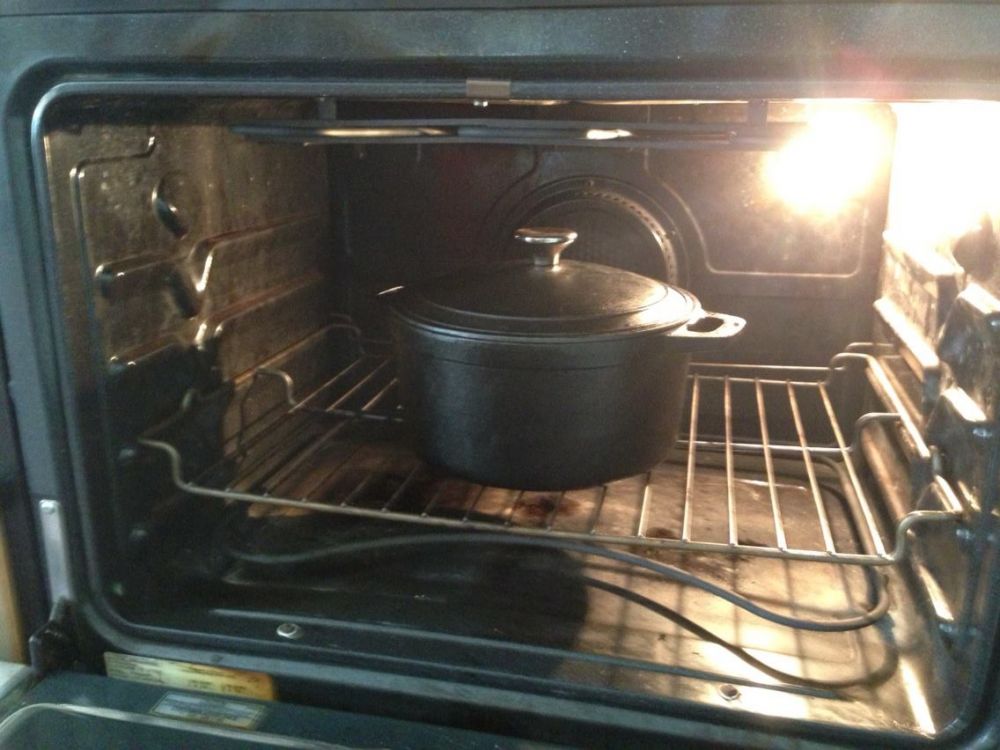 4. 烤箱停火后,戴上防烫伤手套,端出荷兰锅,让其冷却15分钟。