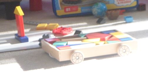 (这里记录的是宝宝三岁多的时候发生的有趣的事。这张图片是从宝宝以前拍的相片里裁下来的。这就是宝宝的装积木的小车。小车的一端有一条小绳子,宝宝就是拉着小绳子把它当做运书的小“wagon”。)