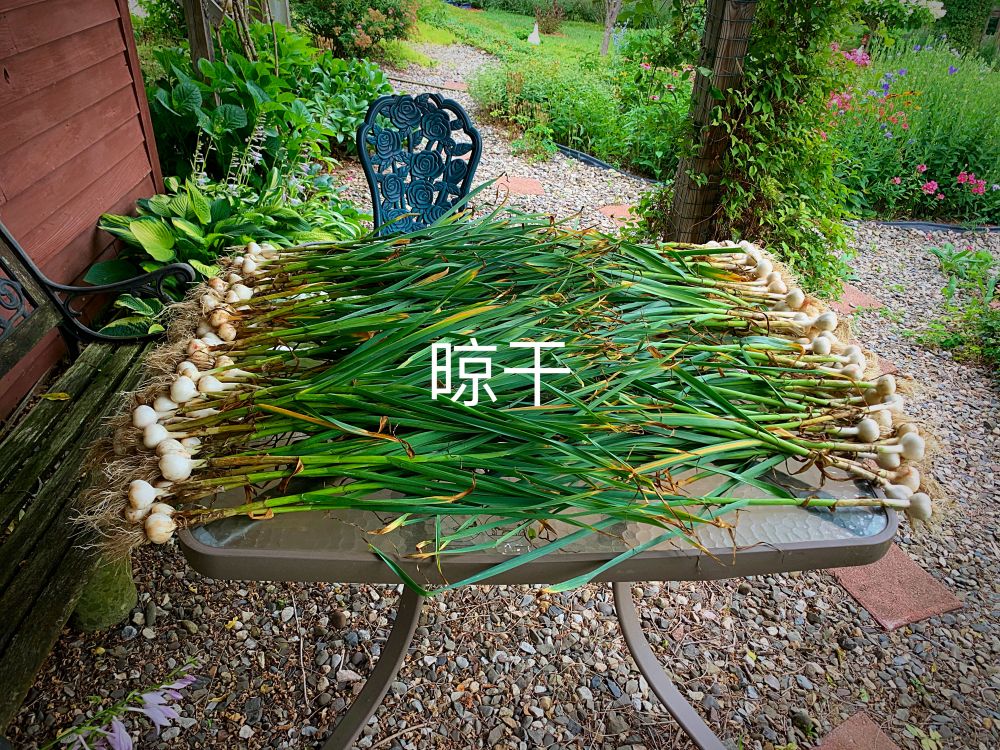 今年我种的大蒜丰收。去年秋天下种,蒜苗在地里过冬,六月可以抽蒜苔吃,七月初收蒜。