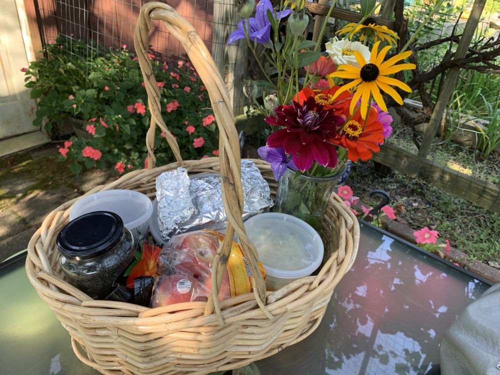 听到夸奖,太太笑着告诉我,她去看望生病在家的闺蜜。她得意地秀这张照片。篮子里放着午饭。几样她炒的菜,那是用自家菜园里的新鲜蔬菜,还包了一些她烤的甜点和花园里采摘的鲜花。她说,闺蜜看到她来探望,心情大好。