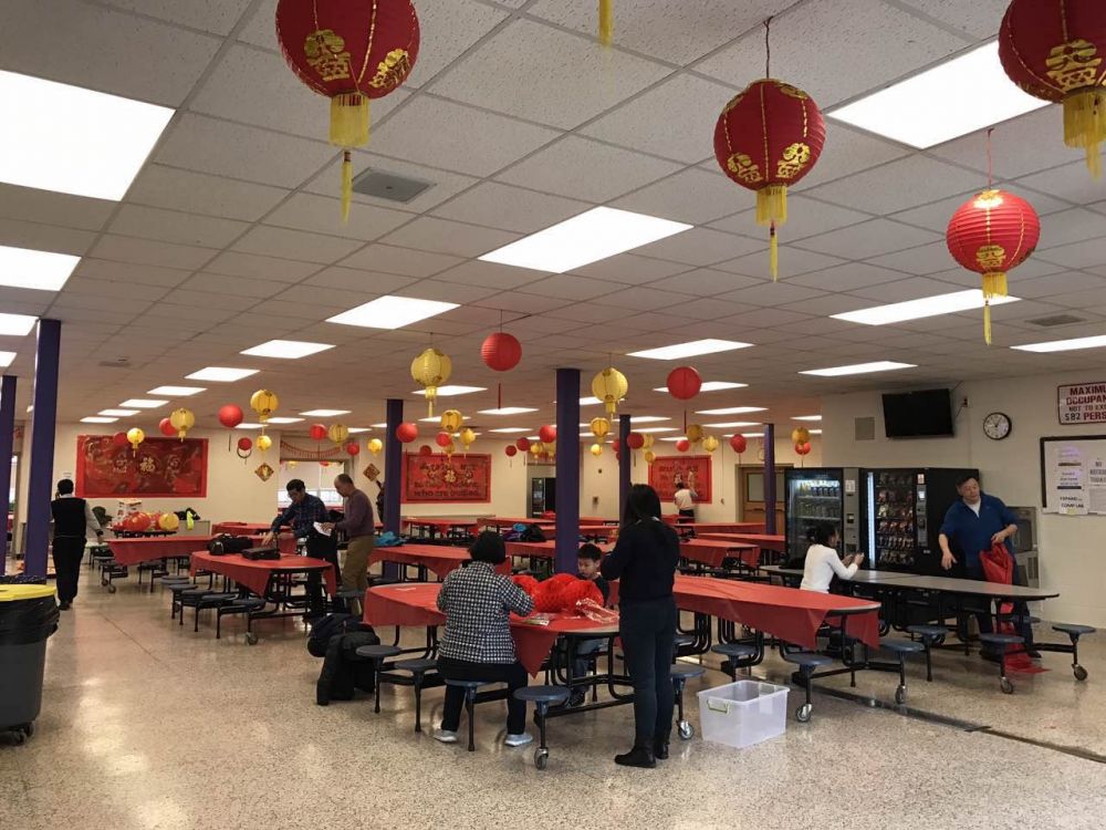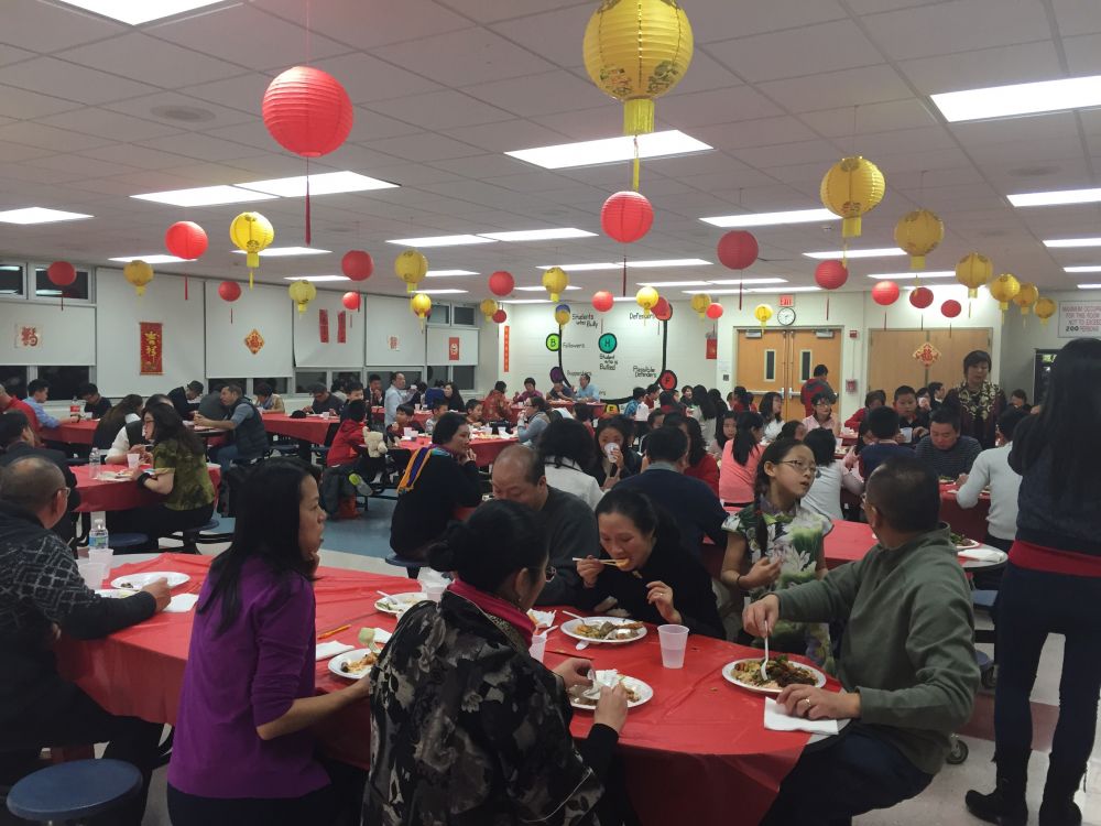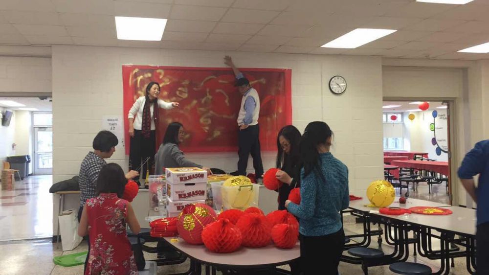 我们租用了Monroe 中学礼堂和饭厅做联欢会场。太太领衔装饰饭厅。她有一些艺术修养。去年春节用过的饰品都存在我家的车库里。6个透明塑料箱里装满了灯笼,剪纸,对联,彩带…。采用透明塑料箱就是太太的窍门。箱内的东西一目了然,今年再添置一些雄鸡年画和一次性的红桌布就差不多了。前几天,她在微信群里发出信息:星期六上午9:30,需要大家帮忙装饰中学饭厅。应者云集,我们从来不缺热情的志愿者,大家见面,节日盛装,喜气洋洋,有说有笑。小孩子们也跑过来要任务。凡是不爬高的工作就分配给孩子们做。他们可高兴了,有样学样,还尽情地发挥创造力,完成任务可好了!听到大人们的夸奖,孩子们喜笑颜开。这个过程就是过年,就是文化传承。