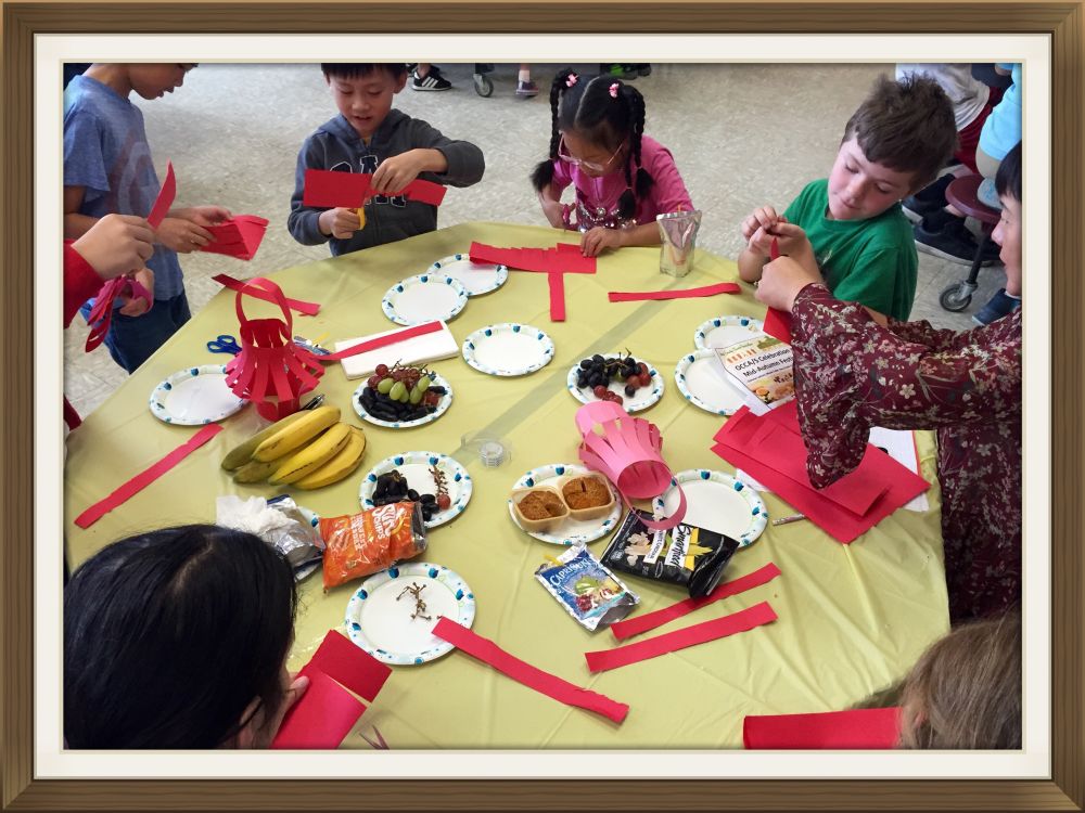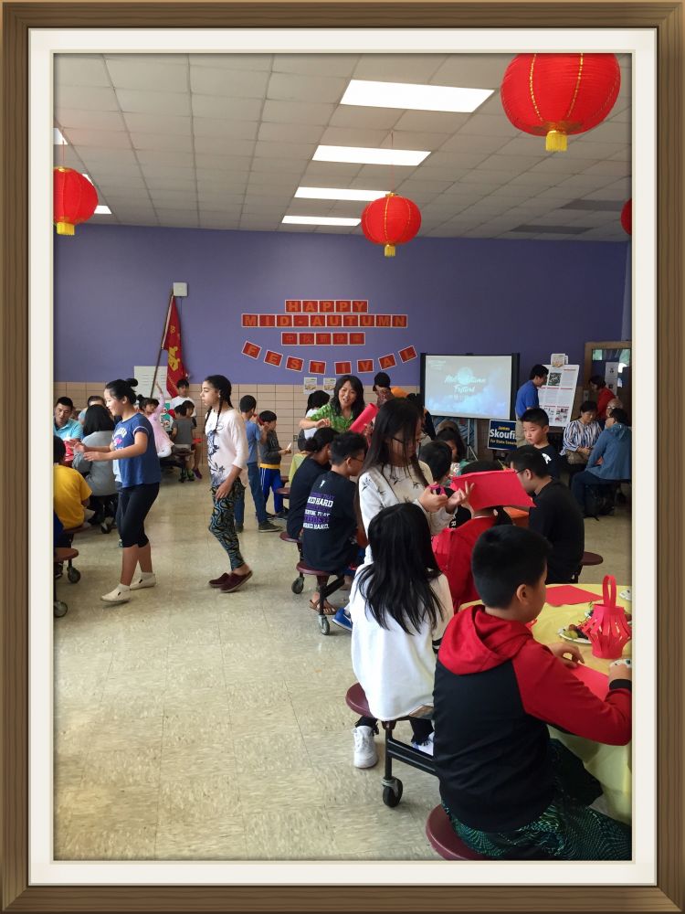 上完课,同学和家长都来到饭厅,听中秋节的传说,品尝月饼和水果。太太是中文学校的老师。今天她还要在会场组织一个活动,做手工:叠纸灯笼。会前,她能设想到:会场一定会乱哄哄的,同学们听不清楚她的讲解,看不清楚她的示范,她也听不清楚同学的提问。所以她先教会她班的学生,然后派他们去每一张桌子上当“老师”,负责教会其他同学和家长,叠纸,做纸灯笼。她班的学生情绪高涨,圆满地当了一会“老师”,有模有样,教会了所有在场的同学和家长,叠出了许许多多的纸灯笼…。今天孩子们和家长一起传承中华文化,欢庆中秋佳节。