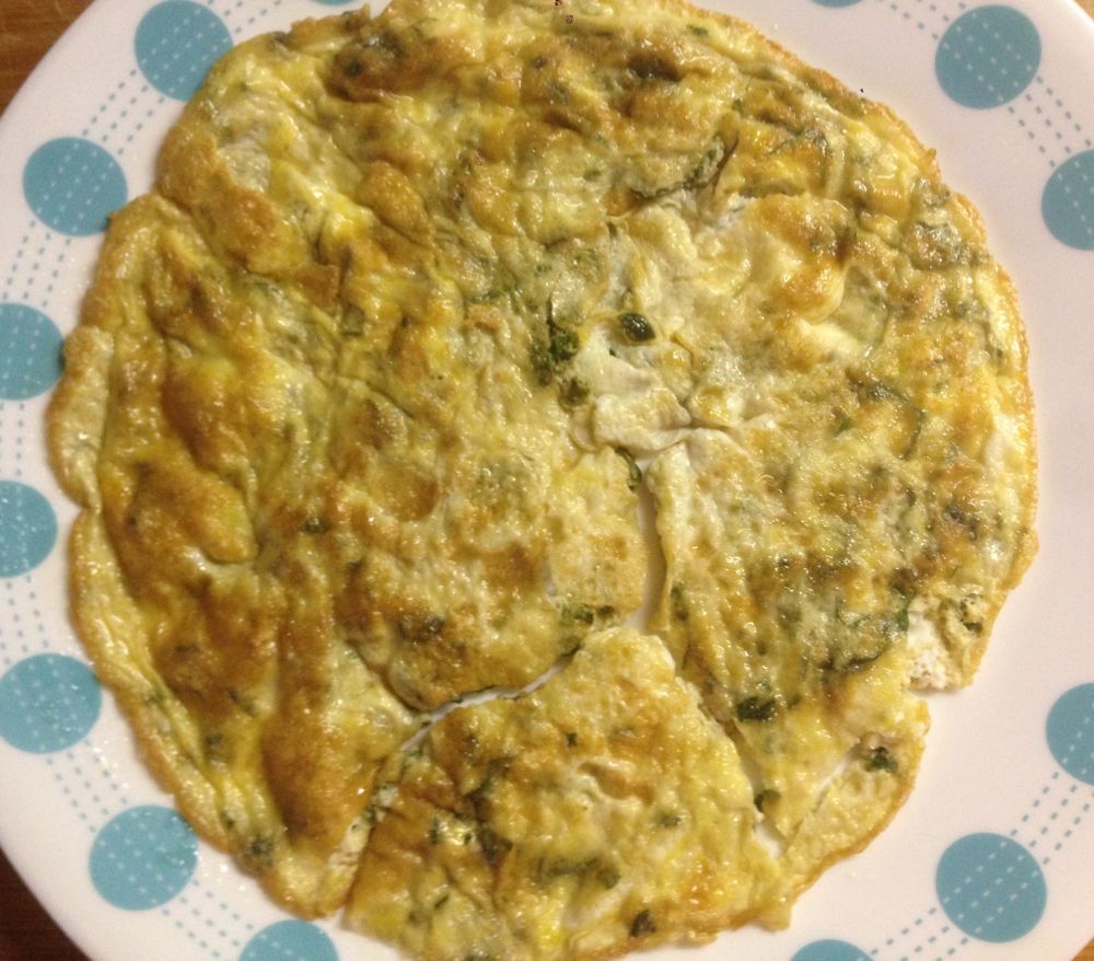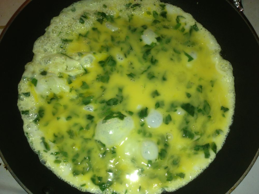 切碎,放入碗中,打个鸡蛋(入锅前又追加第二个鸡蛋),加些许盐