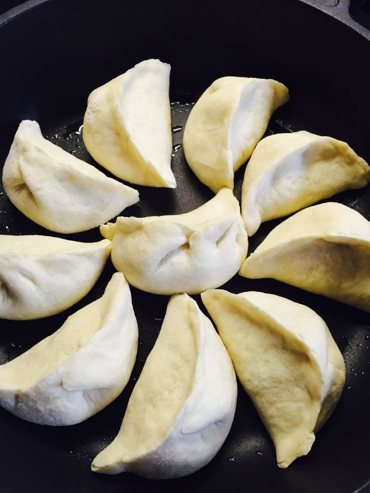 我记得她说下锅煎的时候,只刷一层薄薄的油。我觉得这点很关键,尤其是在胃不喜油腻的时候。煎到饺子底部变微黄,倒入一碗水,差不多三分之一的位置,然后盖盖儿,大火,烧至水干,出锅。