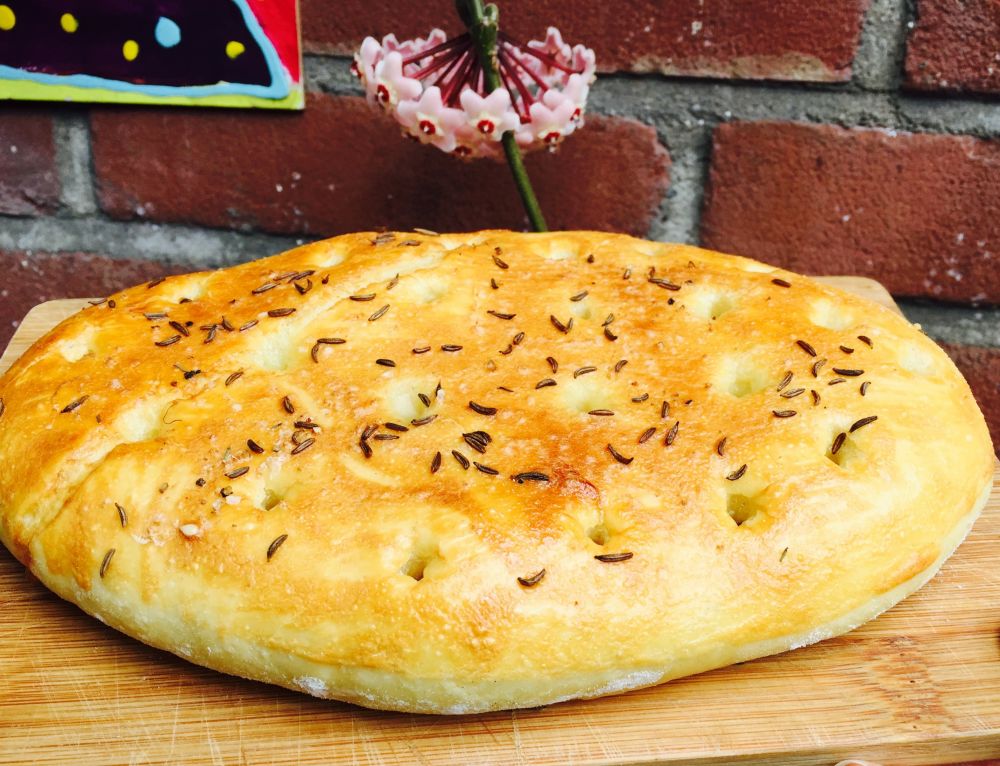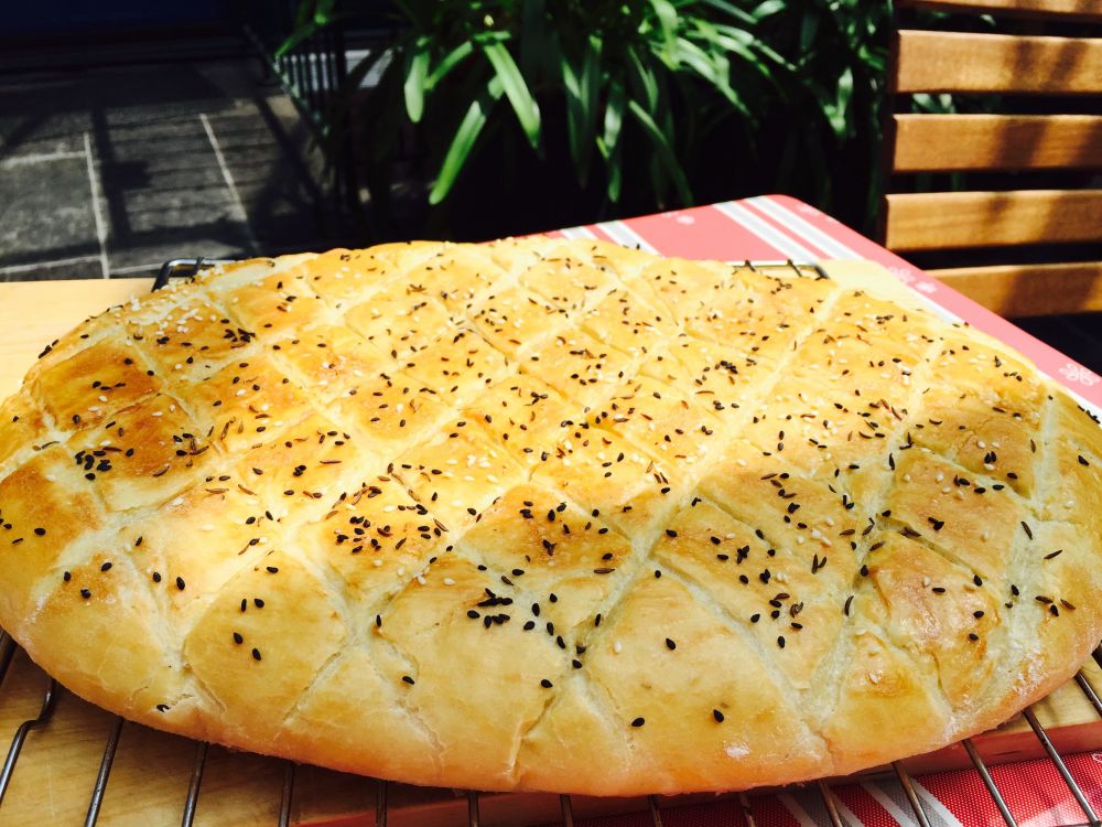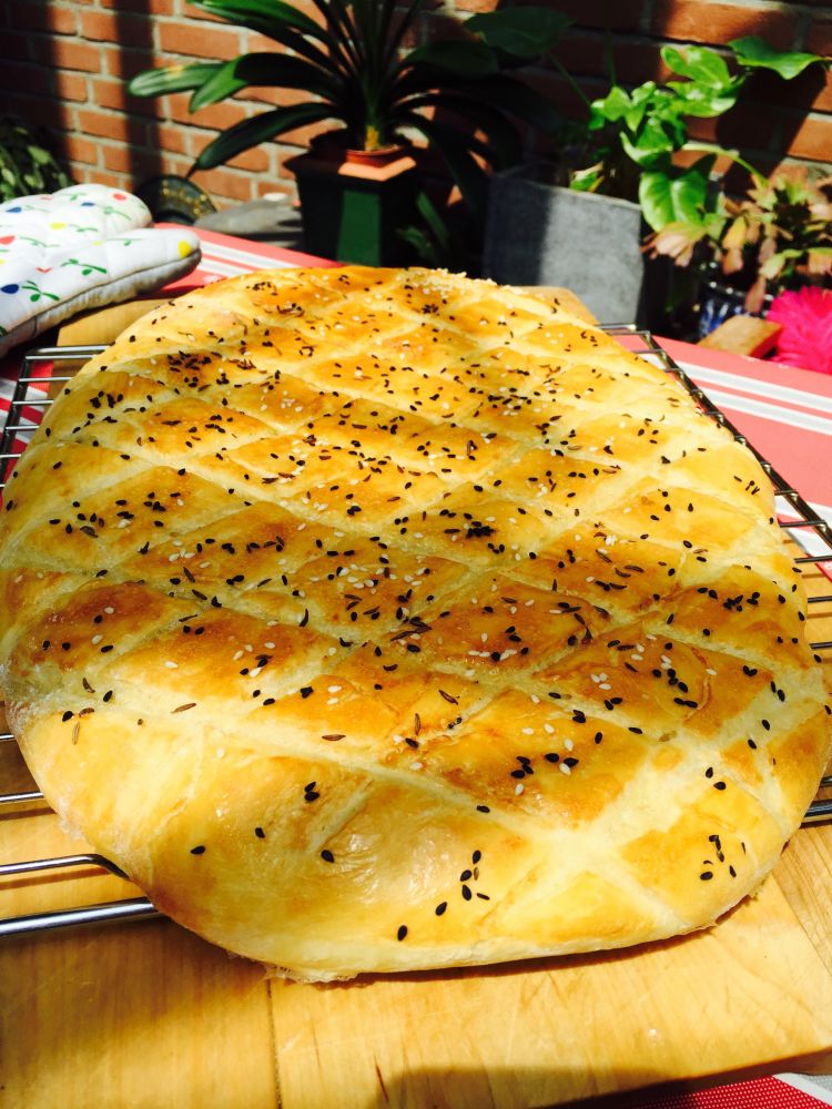 面要发两次,第一次发完后,擀成饼的形状,放在烤盘里,完成二次发面。 然后取出,用刀背画出棱形,刷上鸡蛋和牛奶混合的蛋液,撒上黑白芝麻,和黑棕色的茴香籽儿。入烤箱烤20分钟,打开烤箱,在饼上倒一碗水,让水浸湿饼的表面,马上关上烤箱,用水蒸气再烤10分钟,就大功告成了。口感我比较喜欢,因为加了水蒸气,我觉得没有德国面包那么硬。