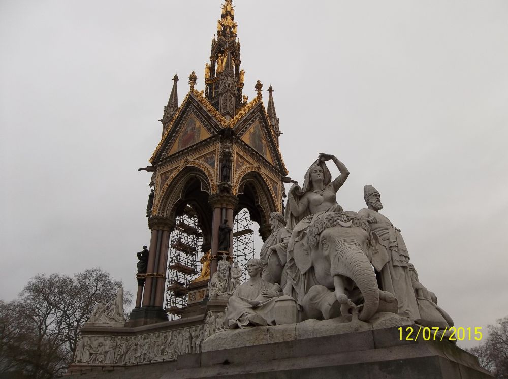 公园南面的阿尔伯特纪念塔。阿尔伯特亲王是维多利亚女王的丈夫,也是她的亲堂兄。亲王于1859年突然病逝,死时才四十岁。维多利亚女王因此陷入长期的丧偶痛苦。