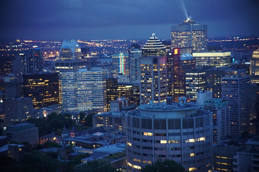 夜晚,在My Royal的山顶上,有一个弧形的瞭望平台,整个城市的夜景一目尽收眼底。应该是是一个"必去的地方吧"。汽车路线,11 和711。白天步行上山,McGill 大学西侧有一条街叫Peel, 一直往上走,再上约500多级阶梯。分几段,最后一段连续约300级。二十分钟。