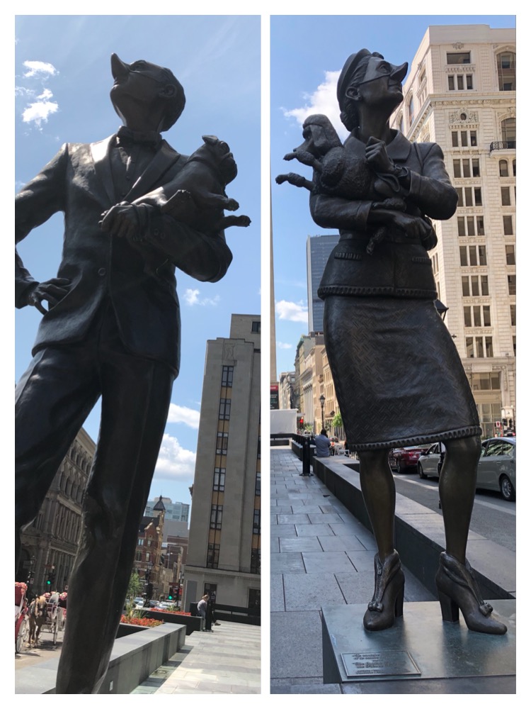 这两个塑像值得思考。左边的是 French Canadian,右边的是 British Canadian。他们都高翘着鼻子互不相看(一边是银行 ,另一边是 Notre-Dame)。但他们手上抱着的狗却是"心灵相通"的。有时候,比人类低一等的动物比我们更容易相处关系!