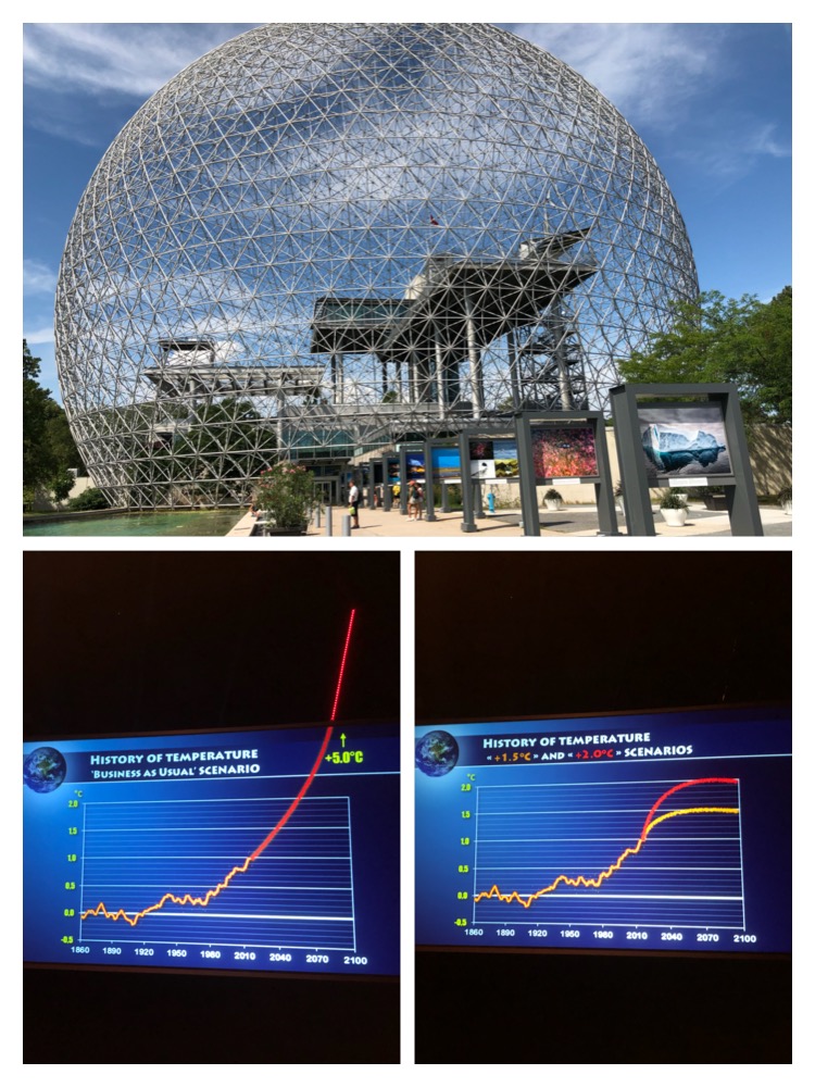 1967年,该市被选中为"世博会"(Expo67) 场地, (初定为莫斯科,后改定为Montreal). 这一片地 (St Helen's Island, and Ile Notre-Dame) 经过改造(扩大,填土建岛)。超过60个国家参加,也开创了现代城市建设的先河。九十年代,在这里建起了Biosphere. 一个介绍环境保护的展馆。下面的两个图分别是"采取措施"与否对将来环境温度预测的对比。