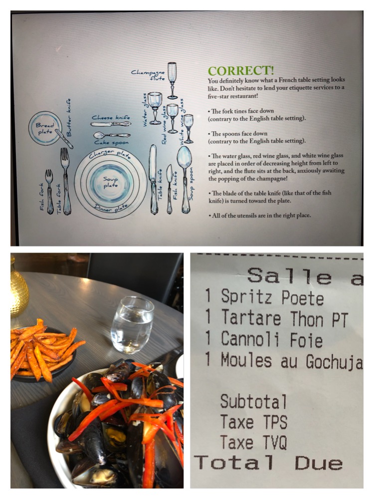来到Montreal,一定要尝一下法餐。在博物馆看完了繁杂的用餐程序和摆设后。怕忘记了出丑,特地拍下存挡。当地找到一家 Restrauant 正钦坐下。白学了。原来只有一个刀和叉! 要了4样东西 (cocktail, feef egg mixed, duck liver, and Muscle)。价钱$$$!如果不是那一小盘充满能量的 French Fry 作为正餐,恐怕我还要回去酒店附近追加一盘饺子!不过,我必须承认,味道真好!