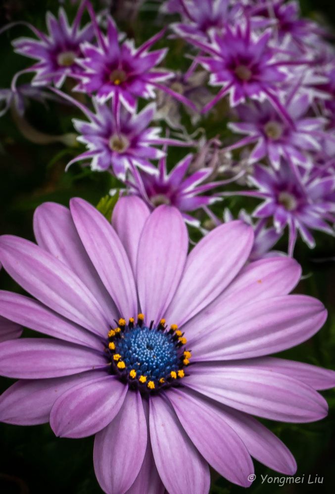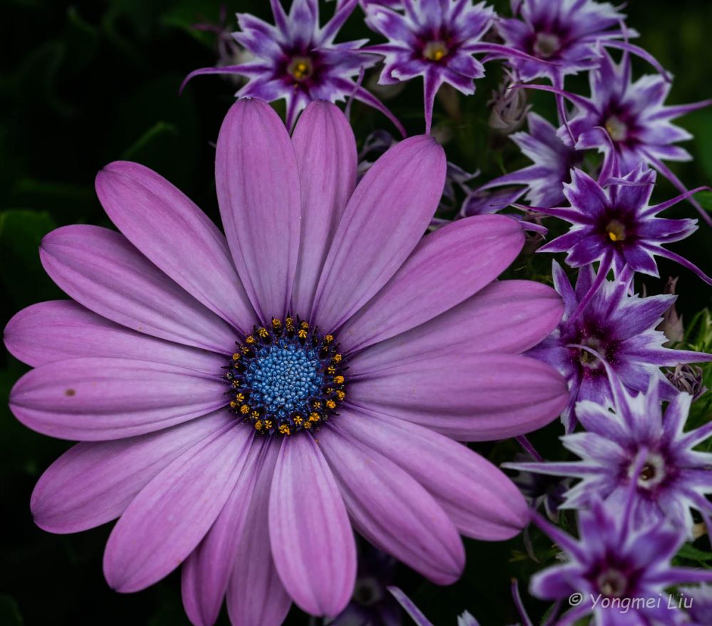 这是一种菊花,蓝色的花心很特别,旁边的放射状的小花好像是石竹一科的。