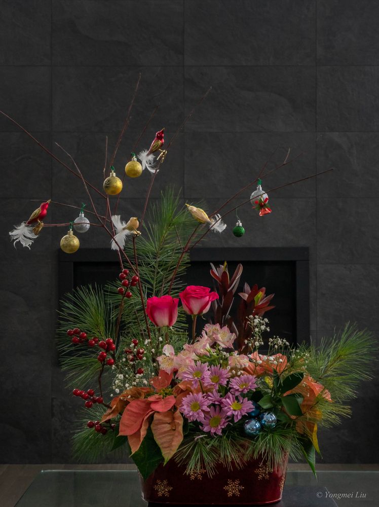 买了一盆粉色的“圣诞红”,剪一簇来插花很是烘托圣诞氛围。下面的白色花盆就是买“圣诞红”带的。背后银色的树枝年年拿来重复使用。