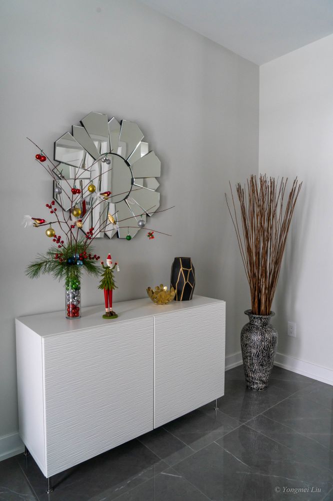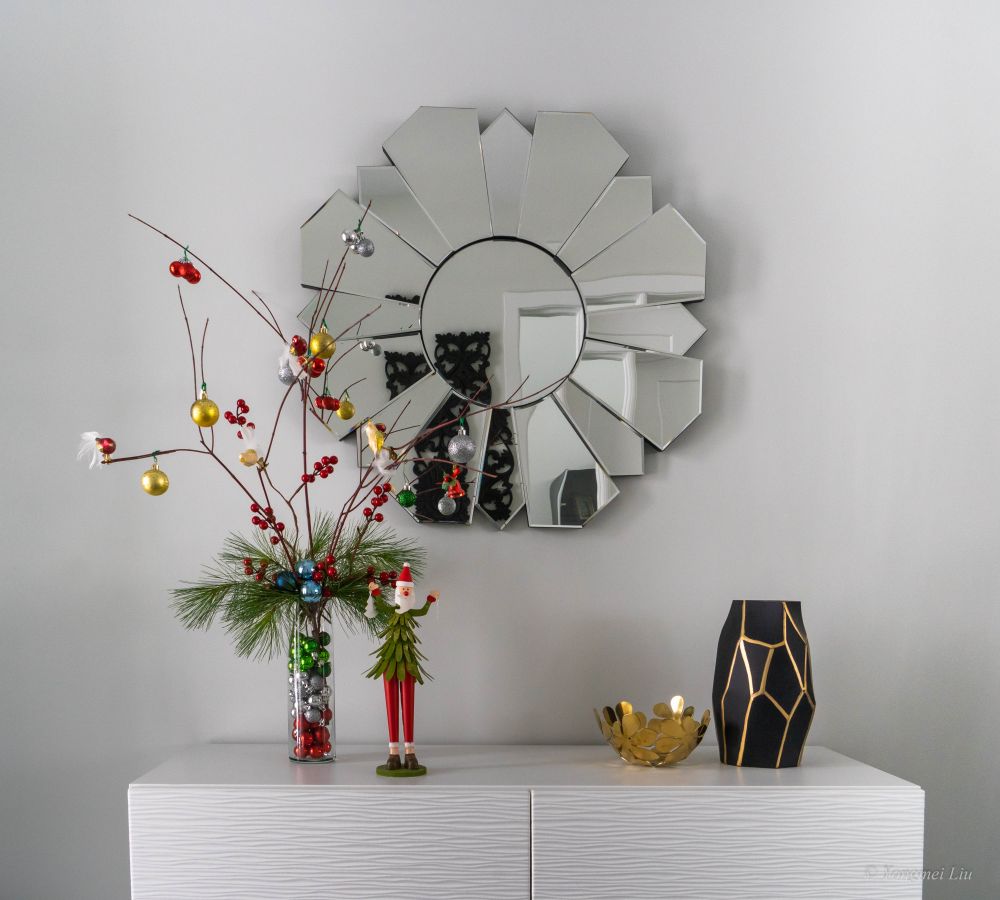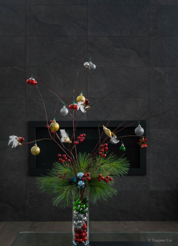 早已厌倦了传统的圣诞树,喜欢现代简洁的“枝干”型圣诞树。自己动手做了一个迷你的,这个红色的树枝到处都是,剪一些插在花瓶里,挂上圣诞球和小鸟,简洁又有节日气氛。红色的小果果在dollar 店买的。