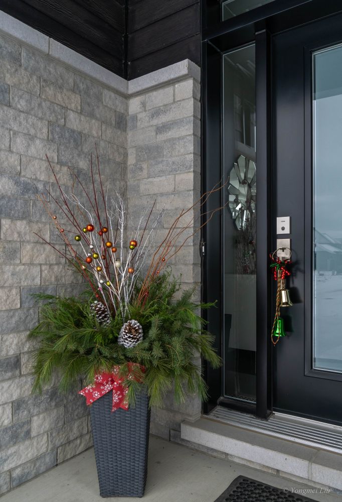 外面剪些松枝加上重复使用的圣诞装饰就成了门口很漂亮的圣诞花盆。商店卖的太贵了,自己很简单又有趣。