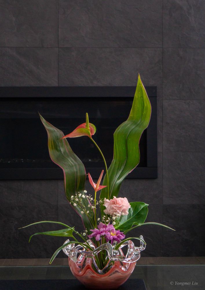 下面的玻璃器皿买了很多年了,也是made in Italy, 也是在home sense 买的,造型独特而且很便宜,大概十块加币上下。红掌和叶子是自家种的。