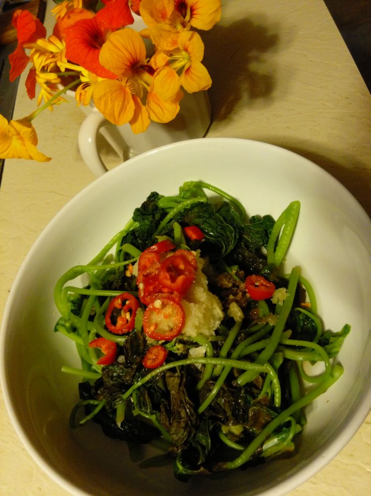 一篮子嫩叶和嫩尖,洗洗,用热水焯了去掉可能的一点儿苦味,就只有半碗了。那么就凉拌吧。看库存还有红辣椒和柠檬,各取半只,红辣椒切细片,柠檬挤汁放入,捣了几瓣蒜,另加盐糖香油花椒油各少许就OK 了。如果还要出门的话,建议就不要加蒜了。纵使大蒜养生,也要考虑别人的感受啊。