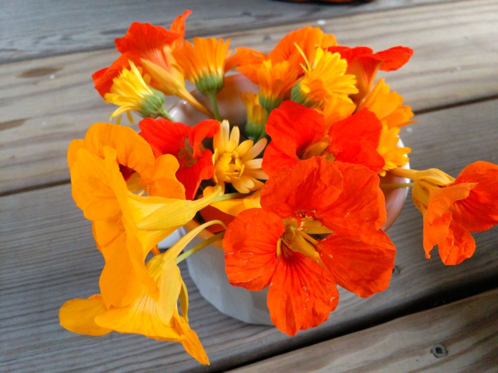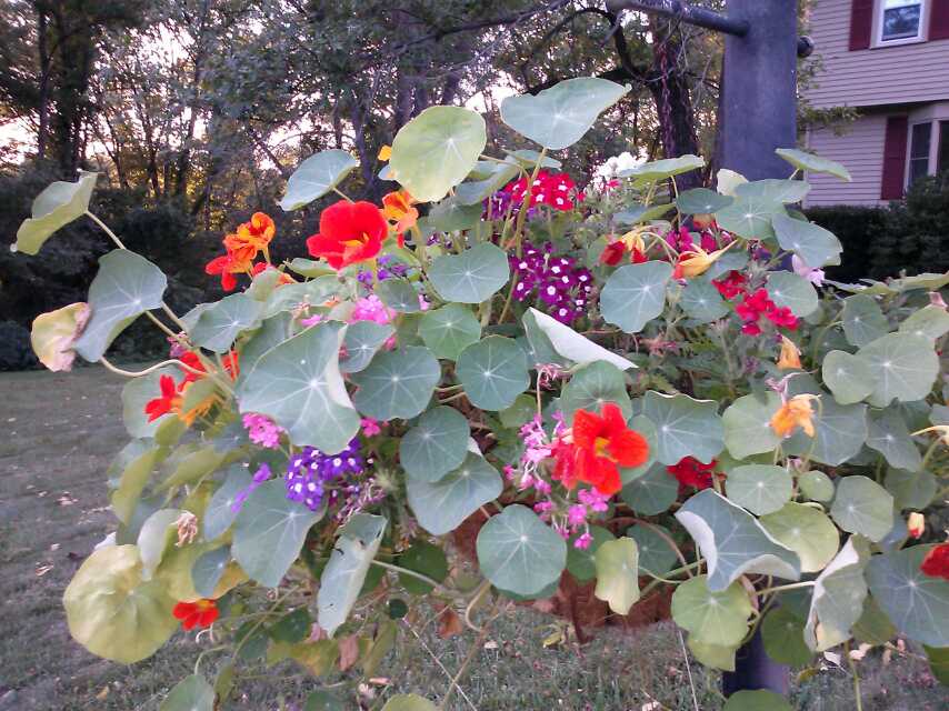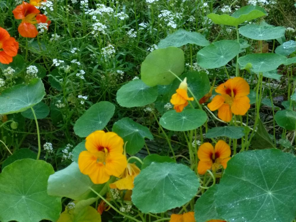 以前俺也尝过旱金莲的叶和花,清爽略有苦味。前几天看到有朋友做旱金莲炒鸡蛋钩起了我的食欲。我这几年过度贪恋旱金莲的好养活又漂亮,自己做的花篮中旱金莲每每是不可或缺的,游泳池边上的一个垒起的高台上也总是栽种旱金莲来装饰。