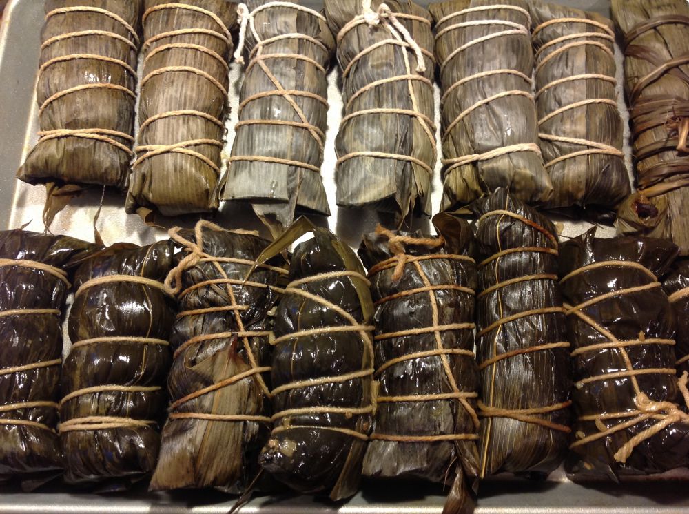 跟风团购了二十几磅的五花肉,挑好的层次分明的部位做了红烧肉,其他的统统腌了风了做成腊肉。但是冰箱还是肉满为患。忽一日,瞥见友人微信显摆长长的腊肉裹入糯米披上粽叶诱惑满满,但是那入锅蒸七八个小时的步骤吓的俺哆嗦了几下停了脚步。生活如此艰辛,当个吃货容易嘛!当个能经受的住吃的诱惑的吃货容易嘛!当个自己动手的正宗吃货就更不容易了!