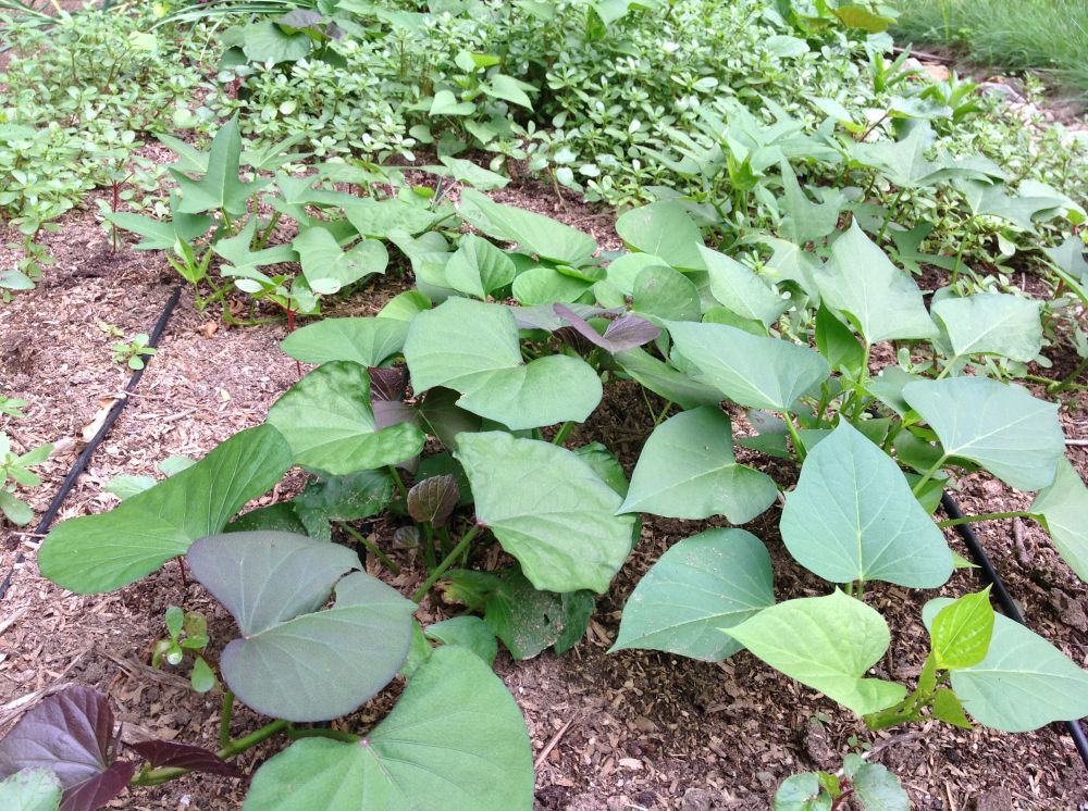 红薯地里的马齿苋留着没拔,既能打牙祭又能当GROUNCOVER。今夏虽然温度升高的晚,但却风调雨顺,省了大把的浇水的银子和功夫,因此辛苦拔草时也能够心平气和眉开眼笑!