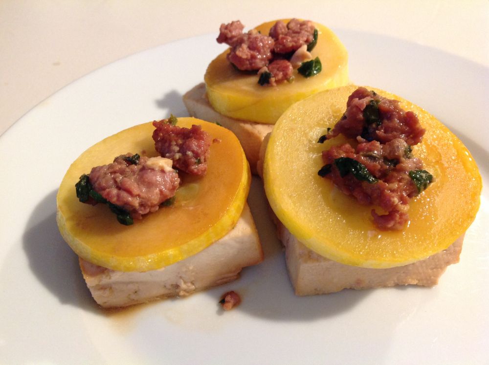 西葫芦切圆厚片,豆腐切厚片,加油稍微煎一下。看看没有一点点荤菜也太艰苦了,又挖了些肉馅加进去,加酱油盐,慢火。这时烧的水正好开,加一点儿盐可以保持烫的菜颜色不失,把洗好的马齿苋加进烫熟,拌好的时候西葫芦也就好了。摆个法国大餐的样式,果然骗得傻小子痛痛快快地吞下他不喜欢的蔬菜。