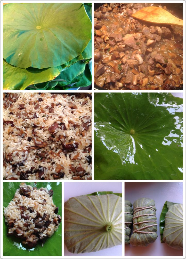 3)包的手法跟长粽子的包法一样,荷叶刷油避免糯米熟后的粘粘,加馅裹紧,最后用棉线捆好,高压锅设一小时,然后睡觉去。