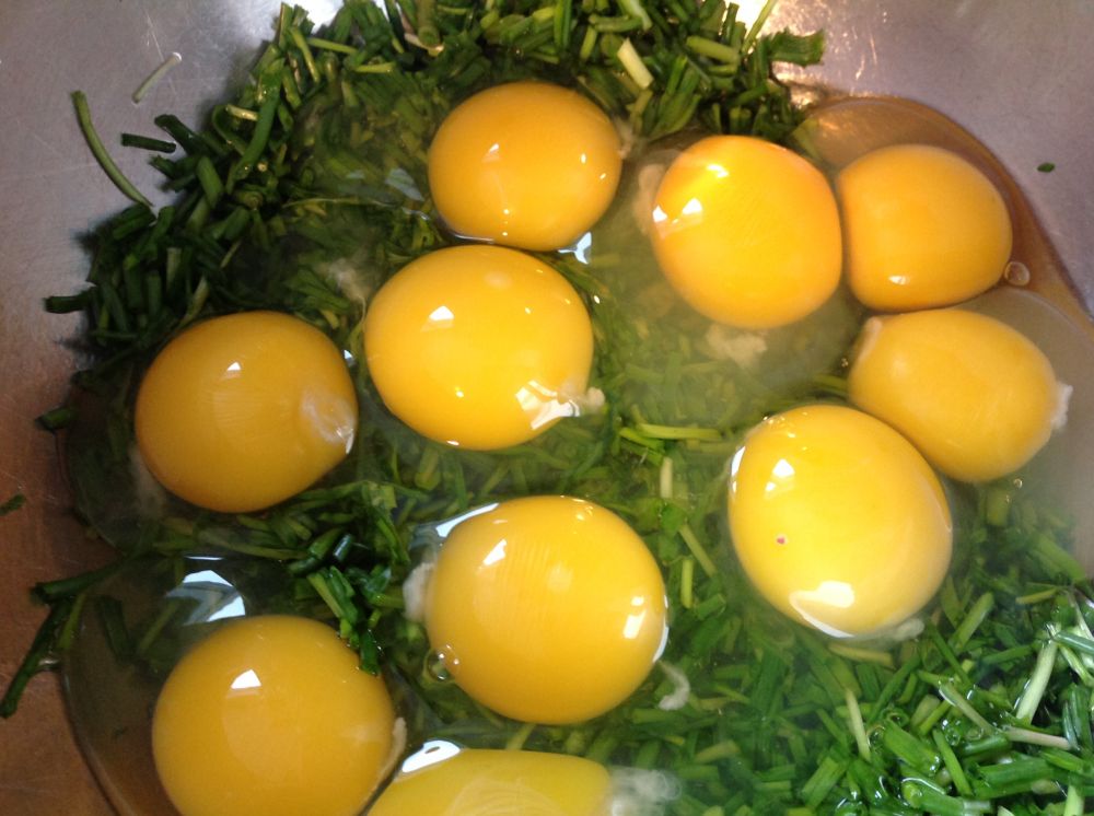 摘掉杂草老干叶,只剩下小宝宝样儿胖乎乎的指头长小葱嫩叶。泡水洗净切碎,挑出10个新鲜可爱的小乌鸡蛋,“噼噼啪啪”几声美妙的声音过后,一片嫩绿配着十点鲜黄!