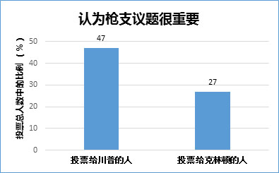 如果此时我们再进一步从党派的角度来检查结果,在投票给川普的选民中有47%的人认为枪支议题对他们的选票至关重要,而投票给克林顿的选民中仅有27%认为枪支议题很重要。两相比较,可见在比例上双方有二十点的差距。