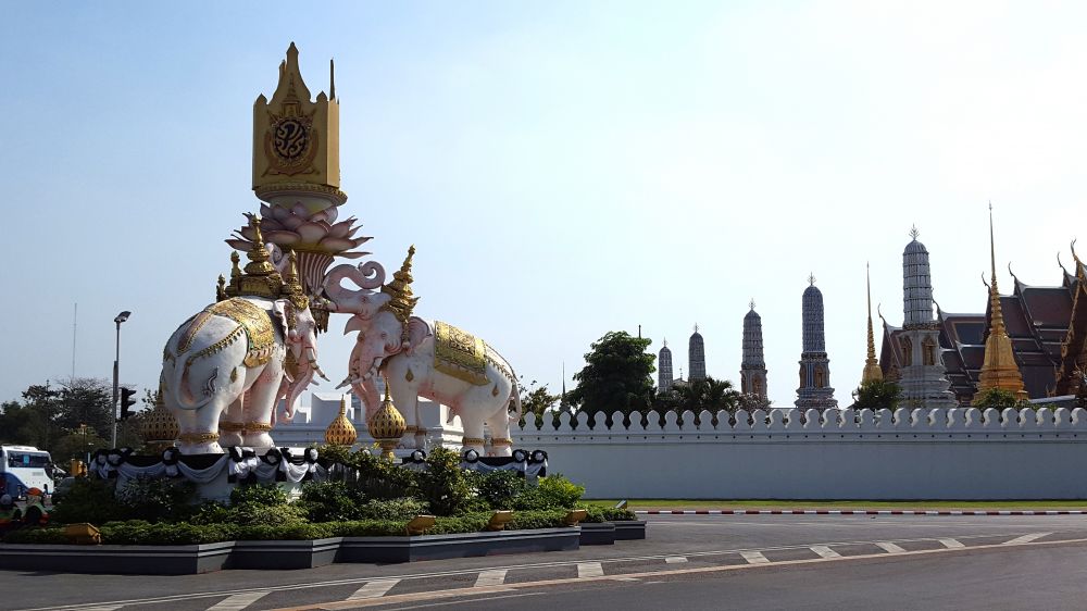 大皇宫The Grand Palace, 包括一所建在皇宫里作为国王举行宗教仪式的佛寺-玉佛寺,都在1782年开始建造,总面积218,000平方米,环绕着整座大皇宫的宫墙,长约1900米。皇宫不让进去参观,只能远远的拍照,到此一游。国王的遗体还躺在里面,一年以后才火化。