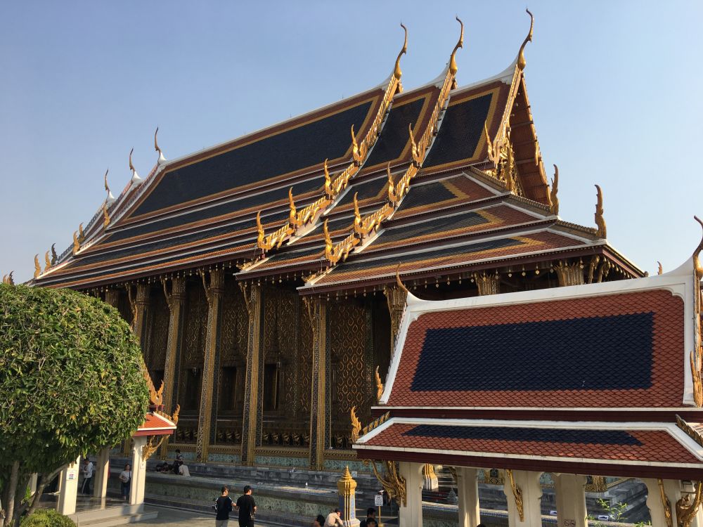 玉佛寺The Temple of the Emerald Buddha,建在大皇宫北边的位置上,佛寺的四周有走廊环绕。泰国人民最崇敬的玉佛,就供奉在佛寺的大雄宝殿中的一座金色的高坐上。玉佛由整块翡翠雕琢而成,漆部宽48.3公分,高66公分。玉佛依照泰国一年三季的时间,更换锦衣,更换锦衣的仪式,由国王亲自主持。里面不能拍照。