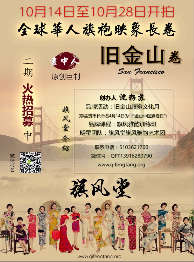 旗袍—中国和华人女性的传统服装,是中国悠久的服饰文化中最绚烂的现象和形式之一,以其流动的旋律、潇洒的画意与浓郁的诗情,表现出中华女性贤淑、典雅、端庄、温柔、清丽、内敛的性情与气质,为了传承发扬这一中华民族的文化瑰宝,第二届旧金山旗袍文化月2017年4月预期而至。