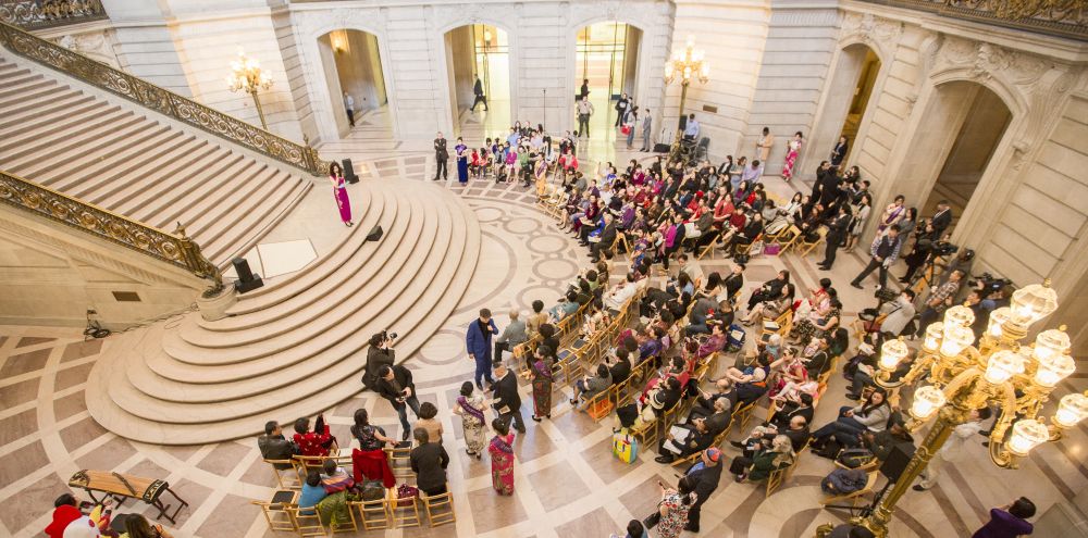 美国当地时间4月14日,由旧金山市政府、旗风堂联合主办的第二届旧金山旗袍文化月市政厅专场活动,旧金山市长李孟贤及夫人林进敏女士、中国驻旧金山总领事罗林泉及夫人乔力女士;旧金山市府礼宾官夏洛特·舒尔茨等中美嘉宾共同出席活动。