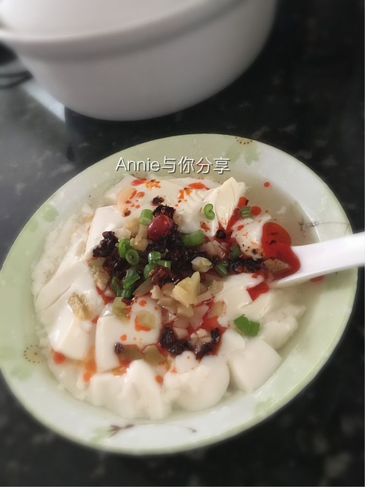 天冷早上来碗咸豆腐花, 热呼呼,辣得微微出汗真舒服,配根油条或者炸油饼。这碗加的嫩榨菜头,辣酱,少许盐或鲜酱油,炸花生米和葱花, 家里没虾皮了, 不然加点提鲜更完美。