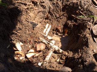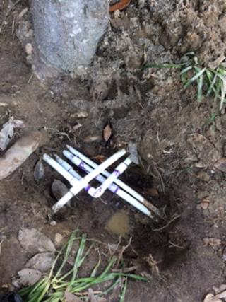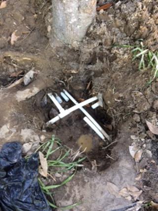 关闭水管主阀门,挖地三尺去掉树根,可见断裂的弯头。这是一根浇草地的水管,这是两根浇水管的一根,平时是关闭的,下面另有一根连在水表与浇水控制阀门之间的水管裂纹才是水患之源,在草地浇水管的下端。最下面另一根应该是生活用水进水管。