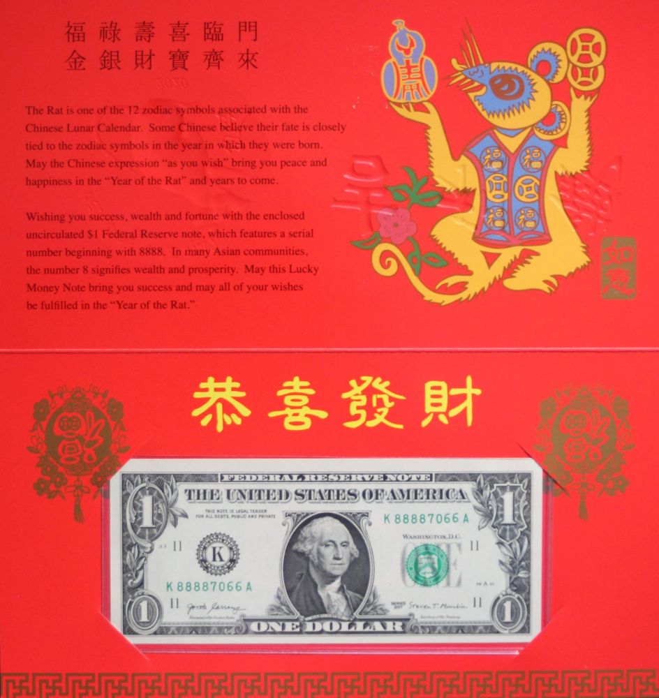 2020年1美元的鼠年产品,是美国雕刻和钞票印刷局在第二代Lucky Money农历日历产品系列中的第七版。 它具有一张清晰的,未流通的,面额为1888的美联储钞票,序列号以“ 8888”开头。该钞票包装在一个带有装饰性浮雕金箔的红色象征性文件夹中,充分体现了中国命理学和十二生肖符号的重要性。