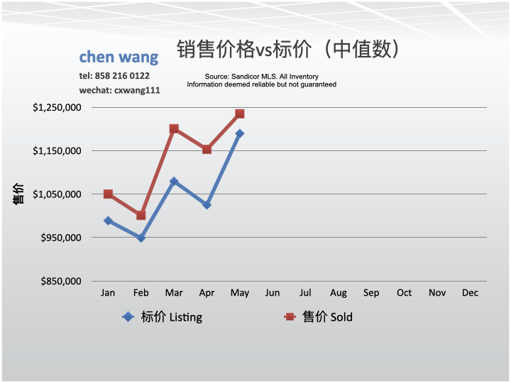 5月售价(sold price)与标价(listing price)相比高出了3.83%;4月份为此数据12.5%。