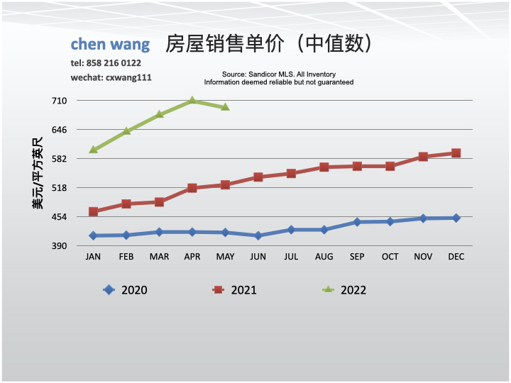 5月份每平方英尺的价格(单价)为694美元。与4月份(709美元)相比下降了2.1%;与去年同期(524美元)相比大幅度上升,32.4%。