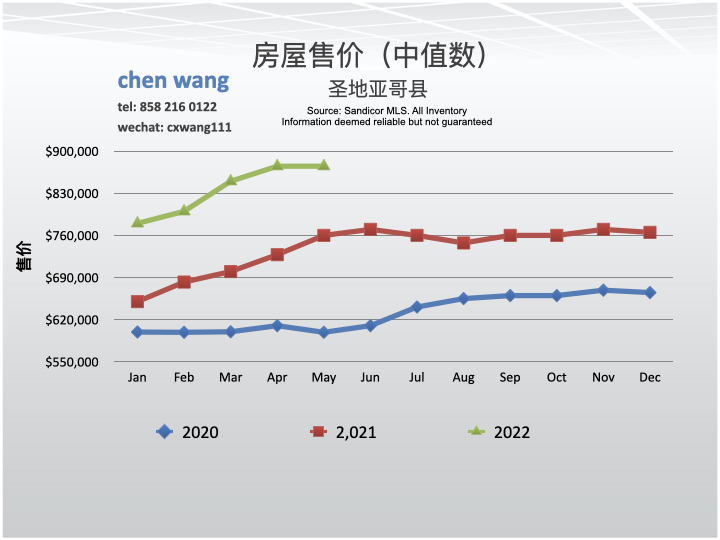 圣地亚哥县房屋销售价格。5月份房屋销售价格中值数为875,000美元。与4月份(875,000美元)相比没有变化;与去年同期(760,000美元)相比上升了15.1%。
