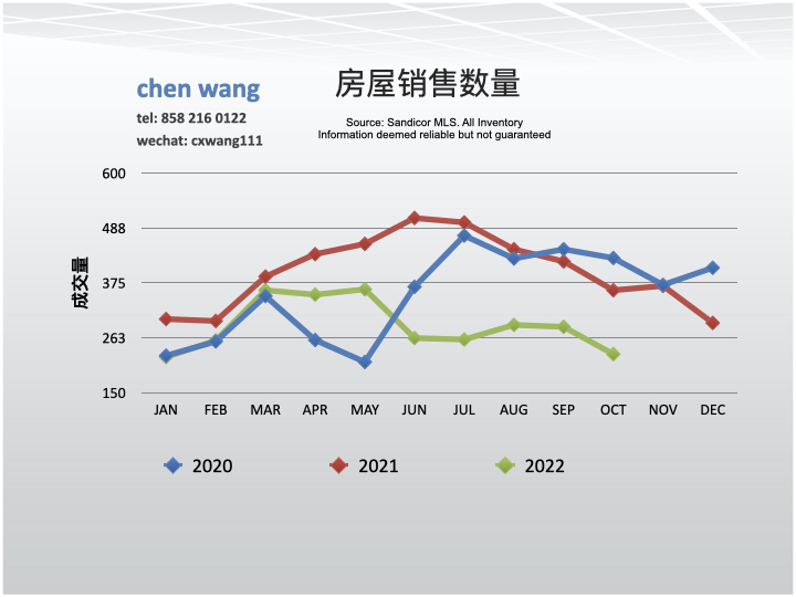2022年10月份销售房子229套,与9月份(285)相比减少了19.7%;与去年同期(444)相比减少了34.9%。本图和后面几个图蓝线代表2020年的数据,红线代表2021年,绿线代表2022年。