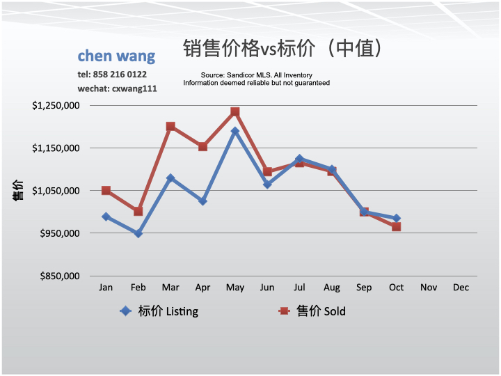 10月售价(sold price)低于标价(listing price)的2.0%。9月份售价低于标价的0.5%。