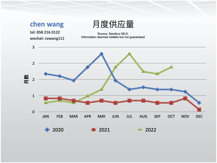 月度供应量指在目前的销售速度下市场上的房屋库存所需售出时间(以月为单位)。圣地亚哥3-4个月的供应量被认为是平衡市场。低月度供应量推高房屋价格,高月度供量造成价格降低。10月份月供应量为2.1个月,比9月份的1.8个月升高了16.7%;与去年同期(0.5)相比升高了320.0%。