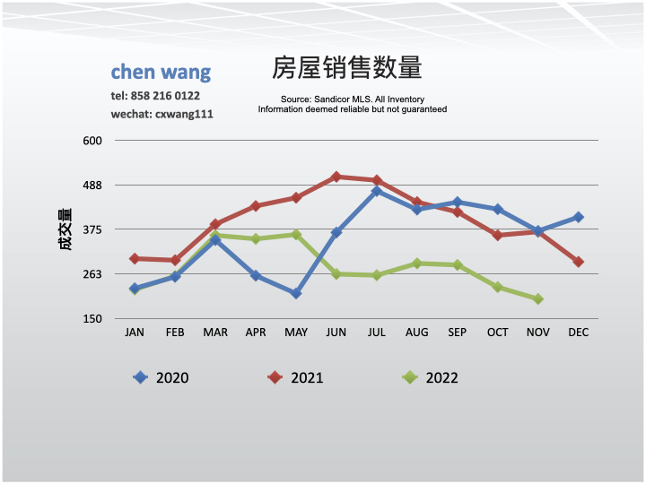 2022年11月份销售房子199套,与10月份(229)相比减少了13.1%;与去年同期(369)相比减少了46.1%。本图和后面几个图蓝线代表2020年的数据,红线代表2021年,绿线代表2022年。