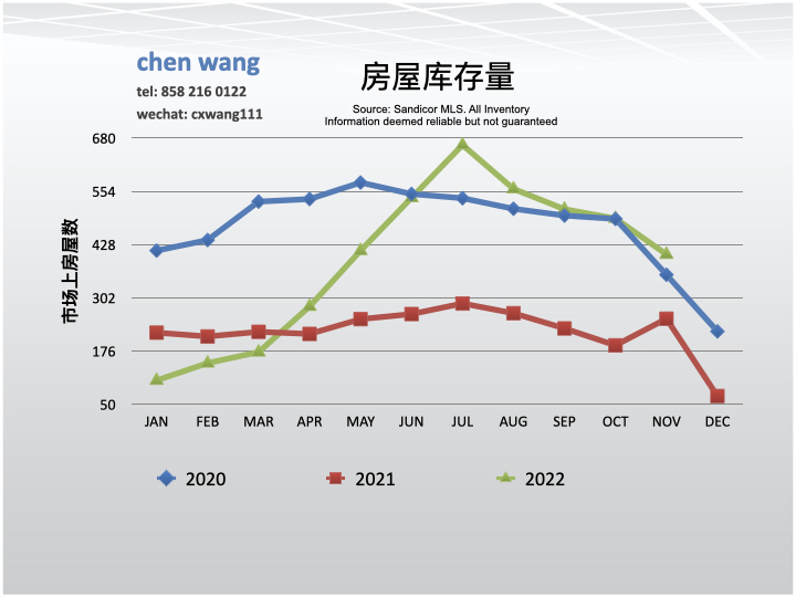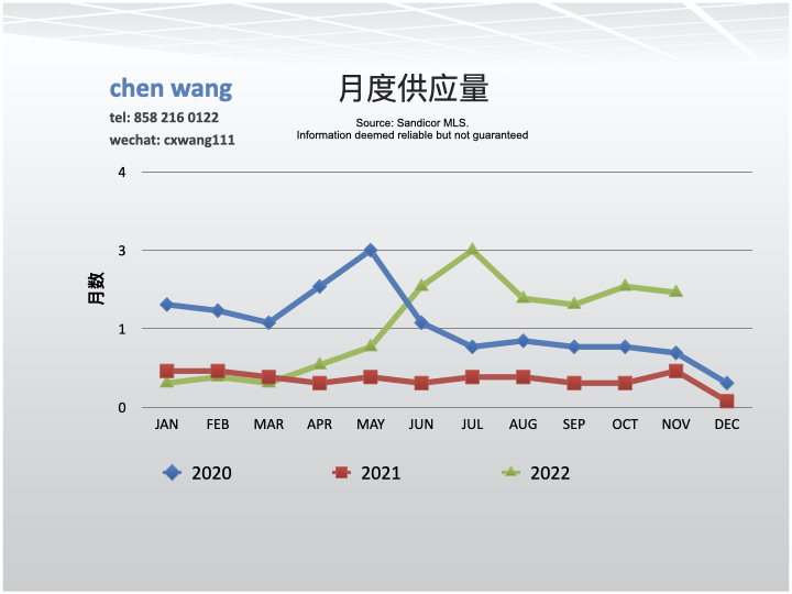 月度供应量指在目前的销售速度下市场上的房屋库存所需售出时间(以月为单位)。圣地亚哥3-4个月的供应量被认为是平衡市场。低月度供应量推高房屋价格,高月度供量造成价格降低。11月份月供应量为2.0个月,比10月份的2.1个月减少了4.8%;与去年同期(0.7)相比升高了185.7%。