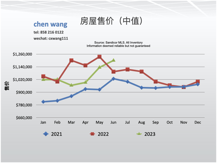 6/23房屋销售价格中值(median)为1,200,000美元。与5月份相比(1,134,000美元)相比升高了5.8%;与去年同期相比(1,094,000美元)升高了9.7%。