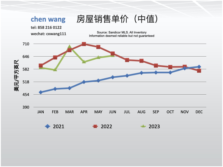 6/23每平方英尺的价格(单价)为650美元。与5月份(640美元)相比升高了1.6%;与去年同期(661美元)下降了1.7%。