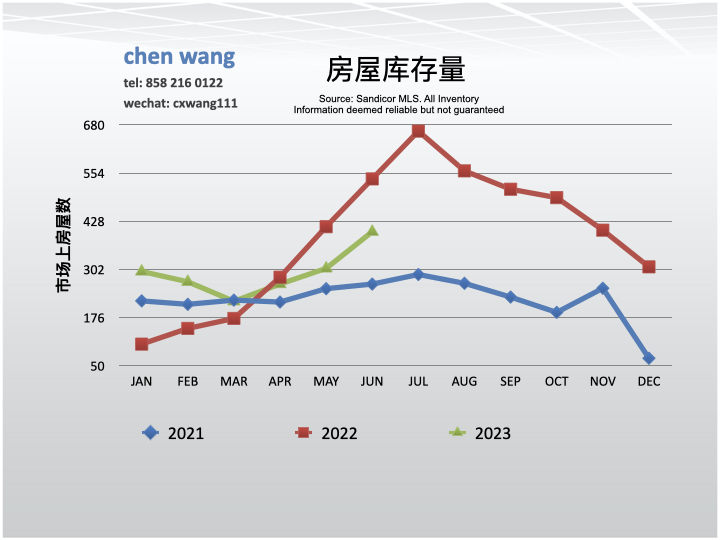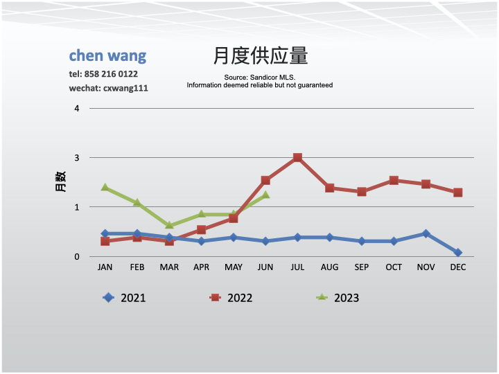 月度供应量指在目前的销售速度下市场上的房屋库存所需售出时间(以月为单位)。6/23月度供应量为1.7个月,与5月份(1.2)相比增加了41.7%;与去年同期(2.1)相比下降了19.1%。圣地亚哥3-4个月的供应量被认为是平衡市场。低月度供应量推高房屋价格,高月度供量造成价格降低。