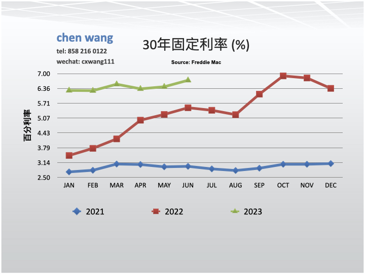 30年贷款利率6/23为6.71%,与5月份(6.43%)相比升高了4.35%;与去年同期(5.52%)相比大幅度上升,21.56%。