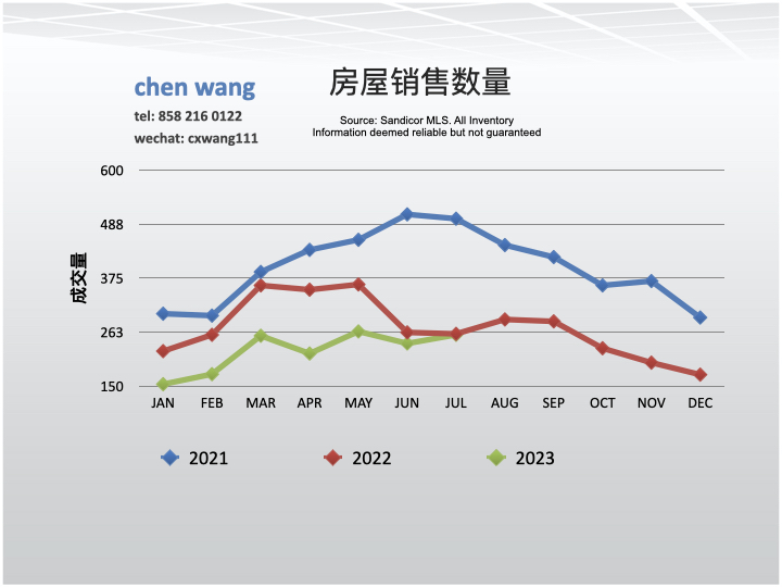 7/2023销售房子257套,与6月份(239)相比增加了7.5%;与去年同期(259)相比减少了0.8%。本图和后面几个图蓝线代表2021年的数据,红线代表2022年,绿线代表2023年。