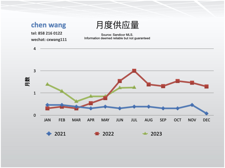 月度供应量指在目前的销售速度下市场上的房屋库存所需售出时间(以月为单位)。7/2023月度供应量为1.7个月,与6月份(1.7)相比没有变化;与去年同期(2.7)相比下降了37.0%。圣地亚哥3-4个月的供应量被认为是平衡市场。低月度供应量推高房屋价格,高月度供量造成价格降低。