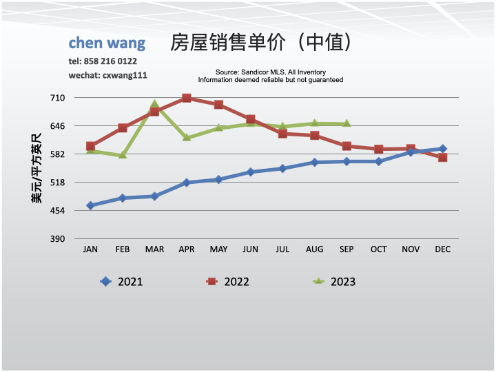 9/2023每平方英尺的价格(单价)为650美元。与8月份(651美元)相比降低了了0.2%;与去年同期(600美元)相比上升了8.3%。
